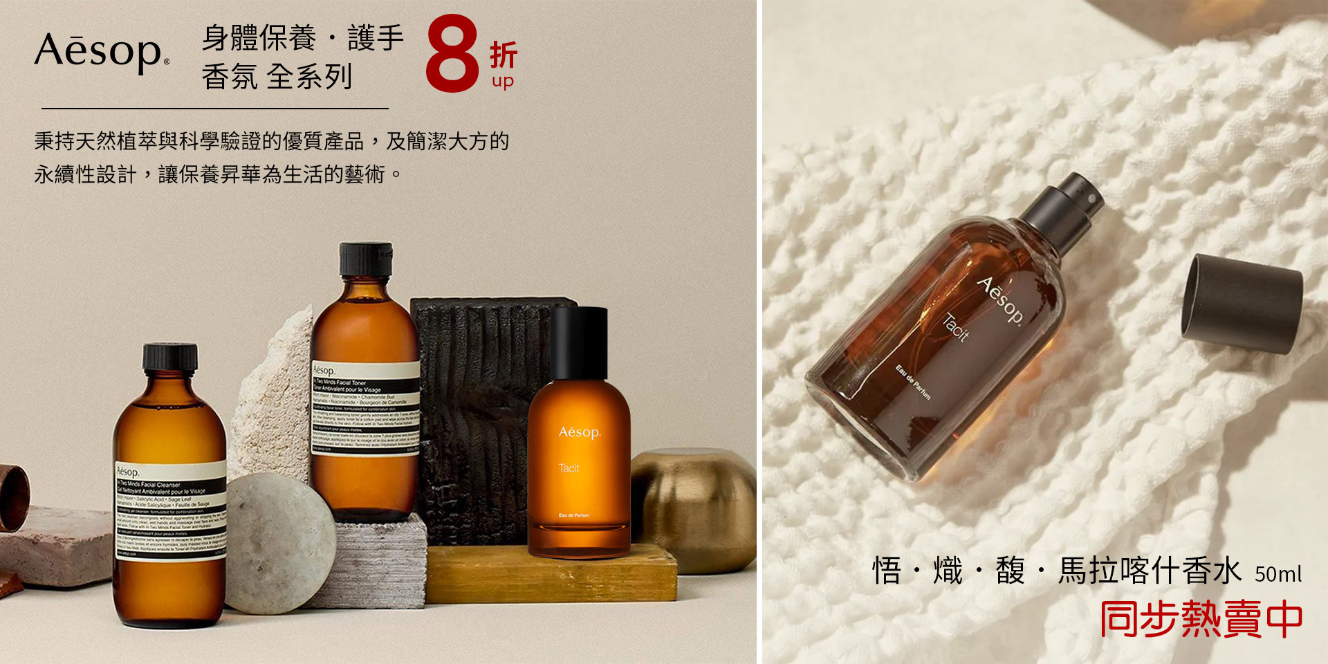 源於澳洲墨爾本的Aesop堅持天然原料及科學驗證的宗旨,從大自然取材,實而不華的簡樸設計及高品質的產品正是高口碑的秘訣,並很快地成為全球知名的美妝品牌之一。