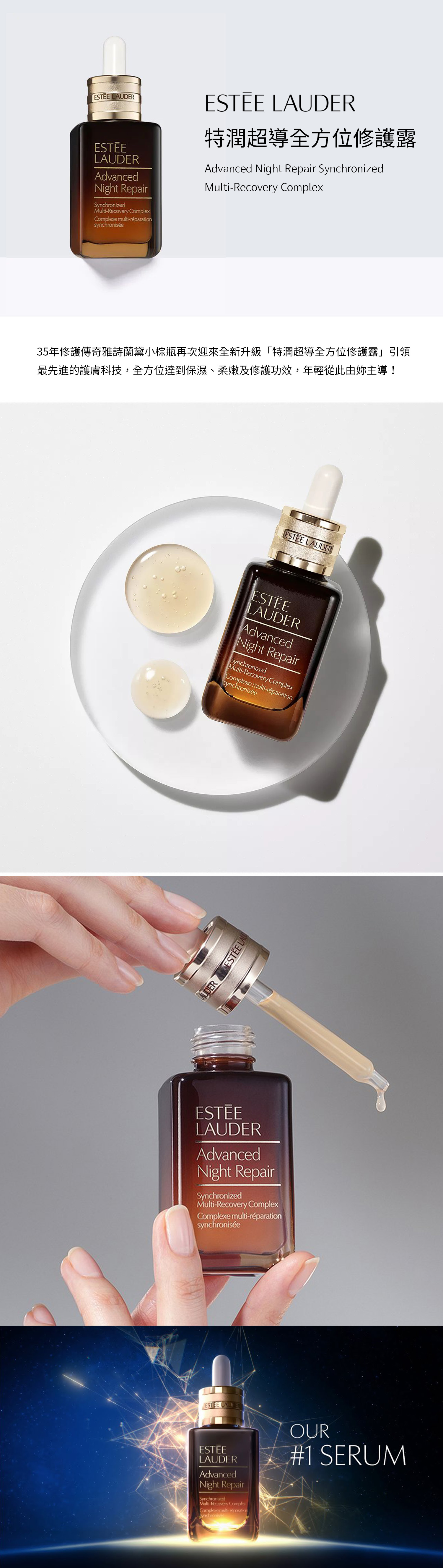 35年修護傳奇雅詩蘭黛小棕瓶再次迎來全新升級「特潤超導全方位修護露」引領最先進的護膚科技,全方位達到保濕、柔嫩及修護功效,年輕從此由妳主導!