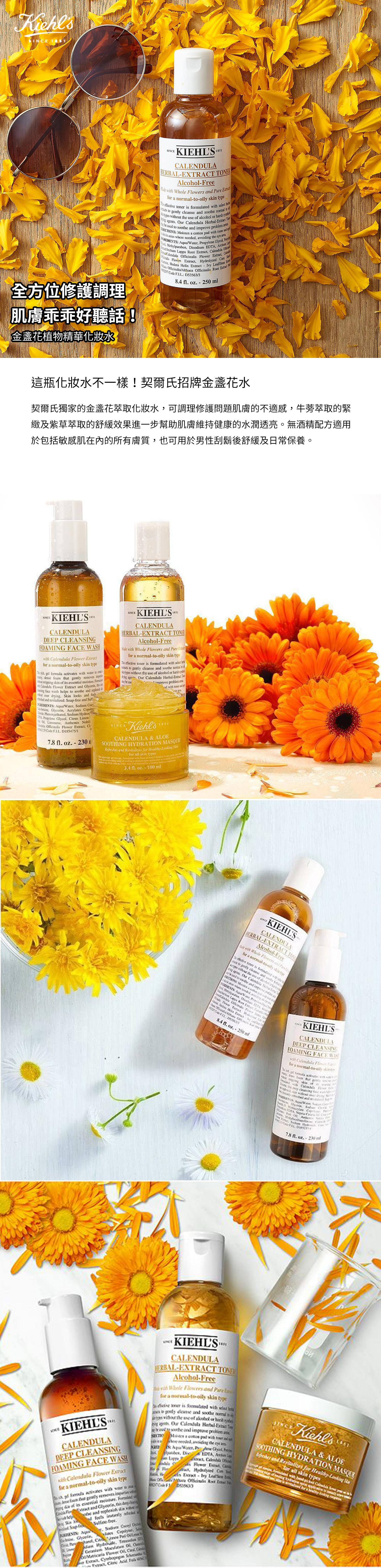 契爾氏獨家的金盞花萃取化妝水,可調理修護問題肌膚的不適感,牛蒡萃取的緊緻及紫草萃取的舒緩效果進一步幫助肌膚維持健康的水潤透亮。無酒精配方適用於包括敏感肌在內的所有膚質,也可用於男性刮鬍後舒緩及日常保養。