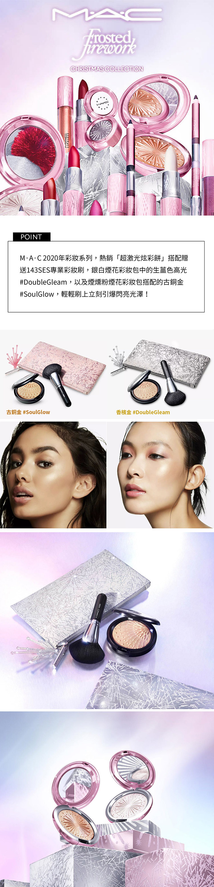 熱銷「超激光炫彩餅」搭配贈送143SES專業彩妝刷,銀白煙花彩妝包中的生薑高光#DoubleGleam,以及煙燻粉煙花彩妝包搭配的古銅金#SoulGlow,輕輕刷上立刻引爆閃亮光澤!