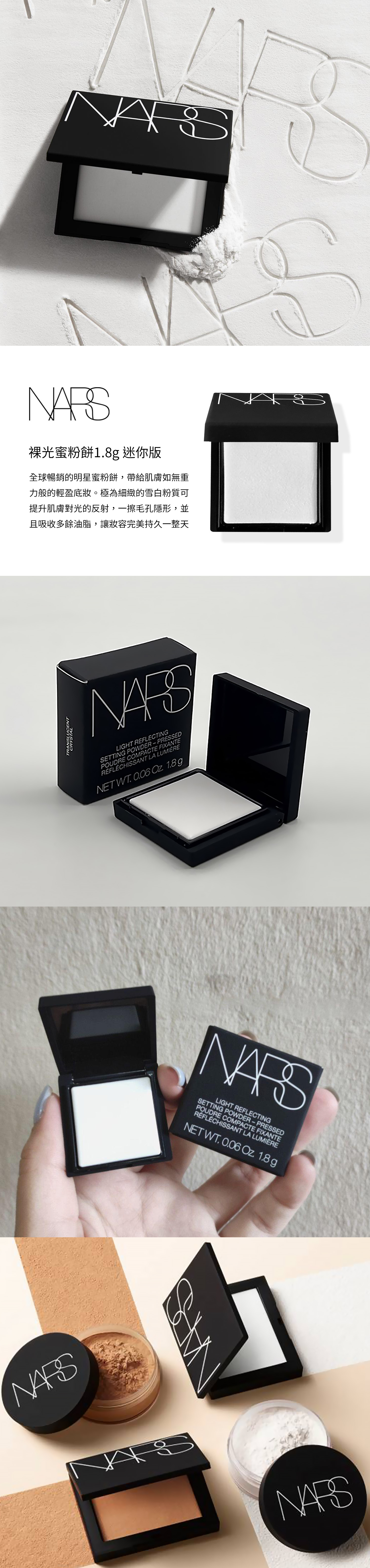 NARS 全球暢銷的明星蜜粉餅,帶給肌膚如無重力般的輕盈底妝。極為細緻的雪白粉質可提升肌膚對光的反射,一擦毛孔隱形,並且吸收多餘油脂,讓妝容完美持久一整天。